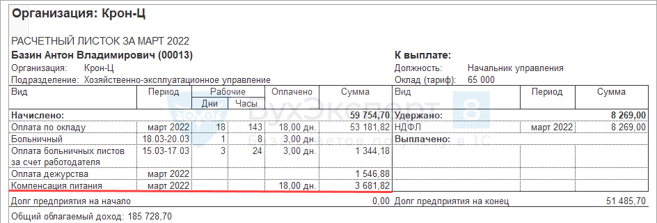 Результат расчета в документе Начисление зарплаты и взносов совпал с нашими вычислениями. В Расчетном листке компенсация питания будет отражена в разделе Начислено.