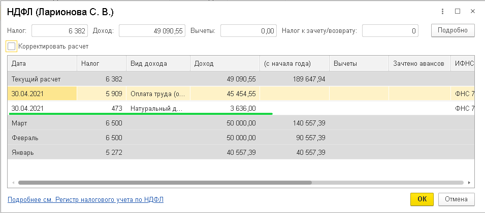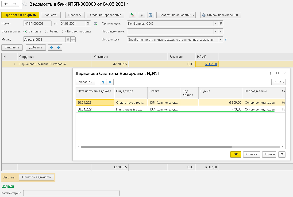 При ближайшей выплате (в нашем примере — зарплата) НДФЛ, исчисленный с натурального дохода в виде оплаты питания, будет удержан: