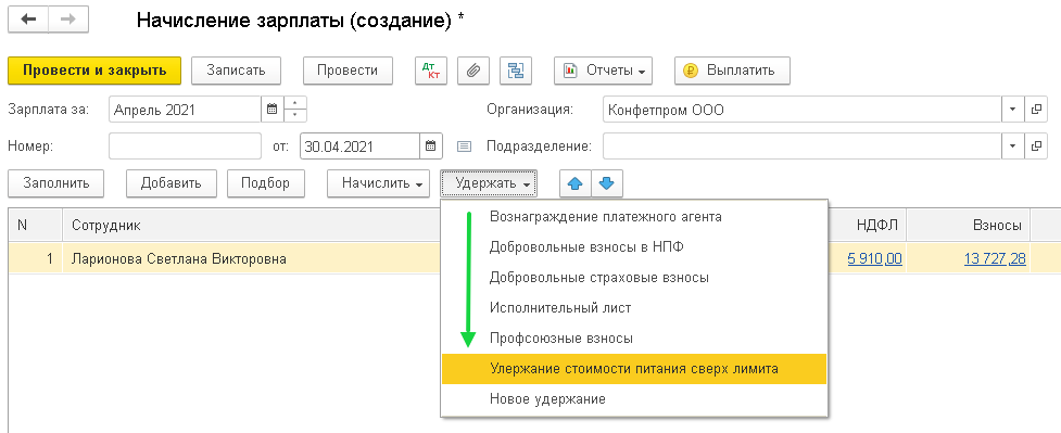 3. Удержание оплаты стоимости питания сверх лимита из зарплаты сотрудника