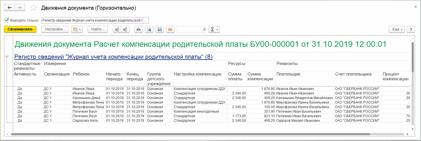 При проведении документа формируются движения в регистре сведений Журнал учета компенсации родительской платы.