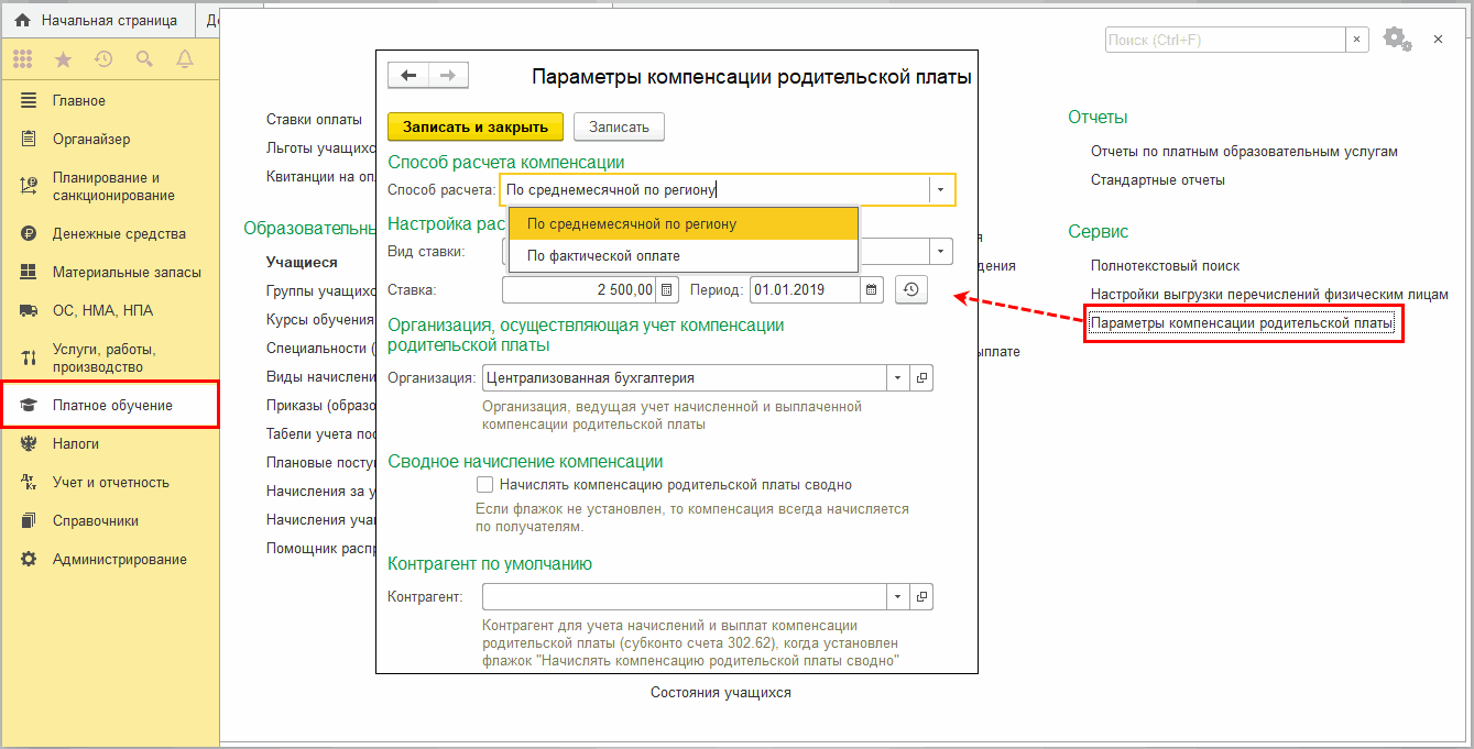 В БГУ2 первоначально следует указать способ расчета компенсации родительской платы в форме Параметры компенсации родительской платы раздела Платное обучение.