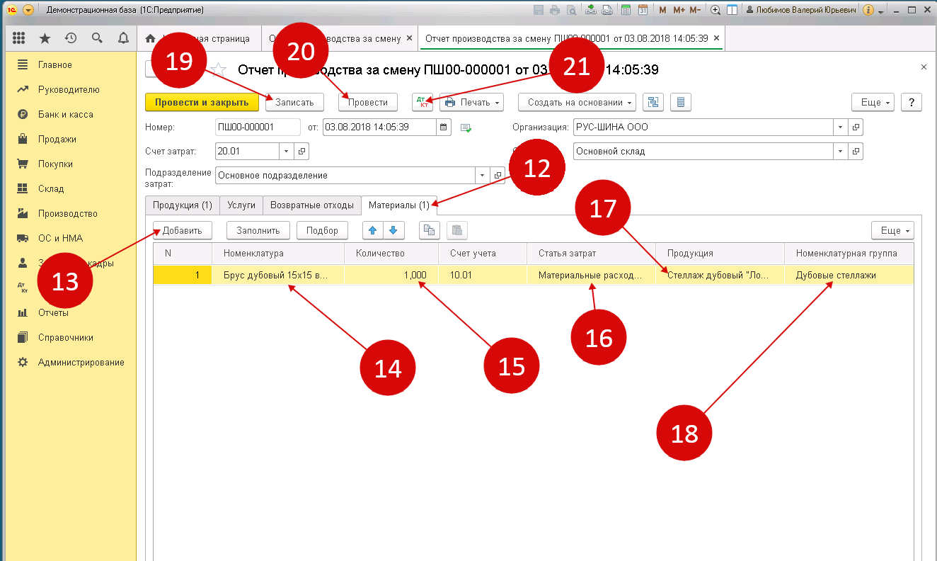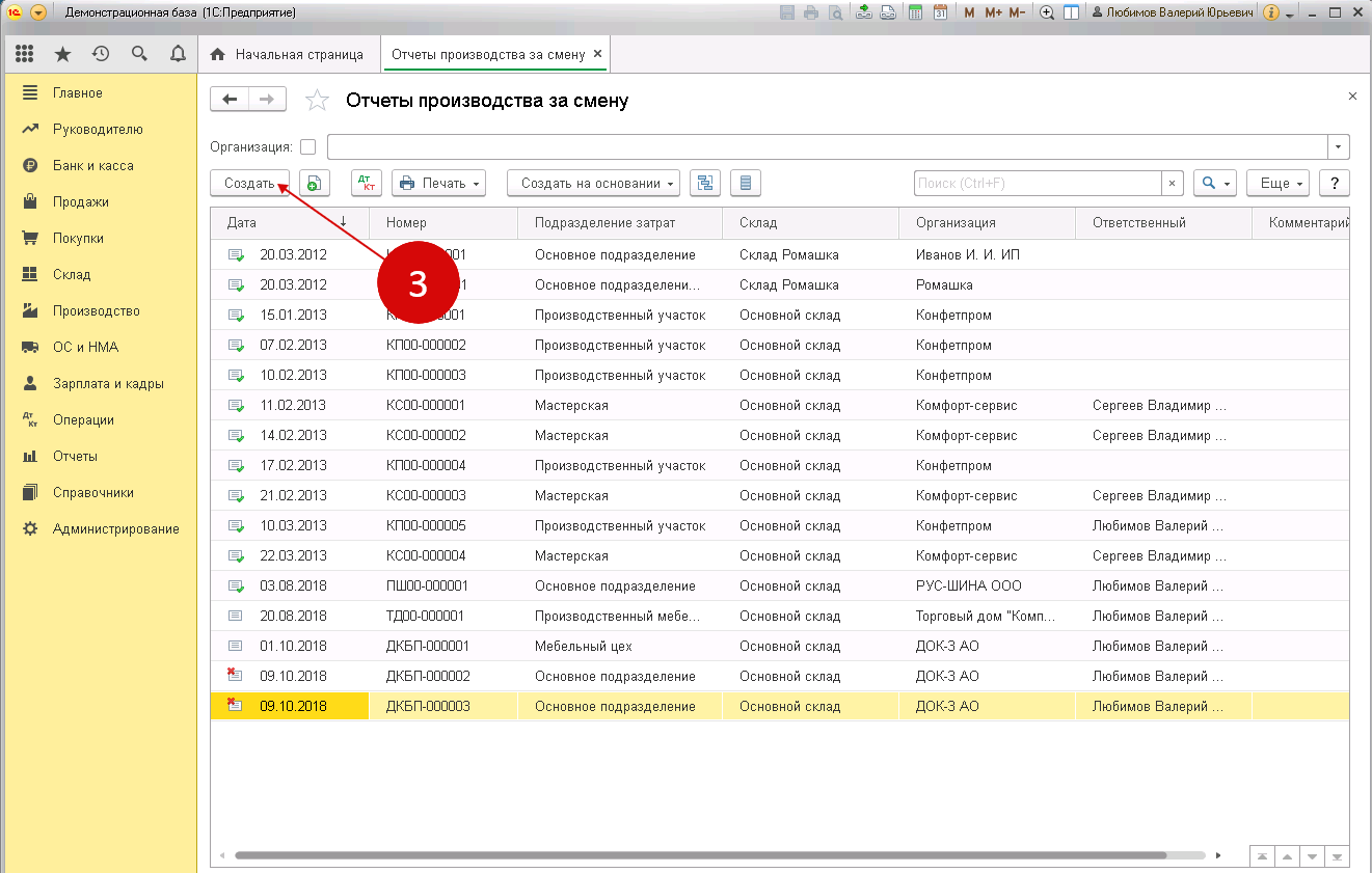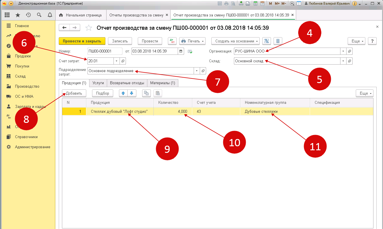 Шаг 3. Оформите в 1С 8.3 Бухгалтерия отчет производства за смену
