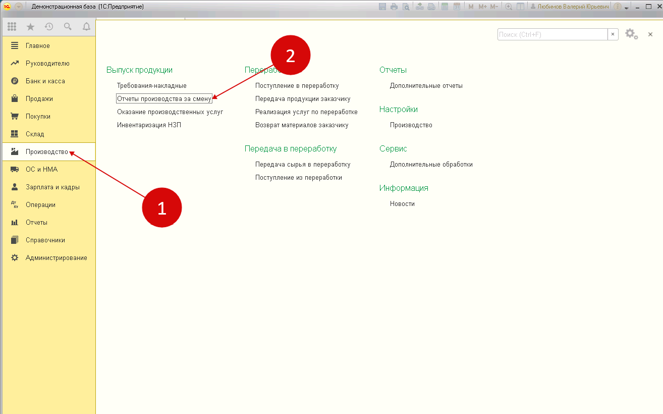 Документ «Отчет производства…» в 1С 8.3 предназначен для отражения в учете выпуска продукции. Также в нем можно сделать списание материалов в производство. Для создания отчета зайдите в раздел «Производство» (1) и кликните на ссылку «Отчеты производства за смену» (2). Откроется окно для оформления отчета.