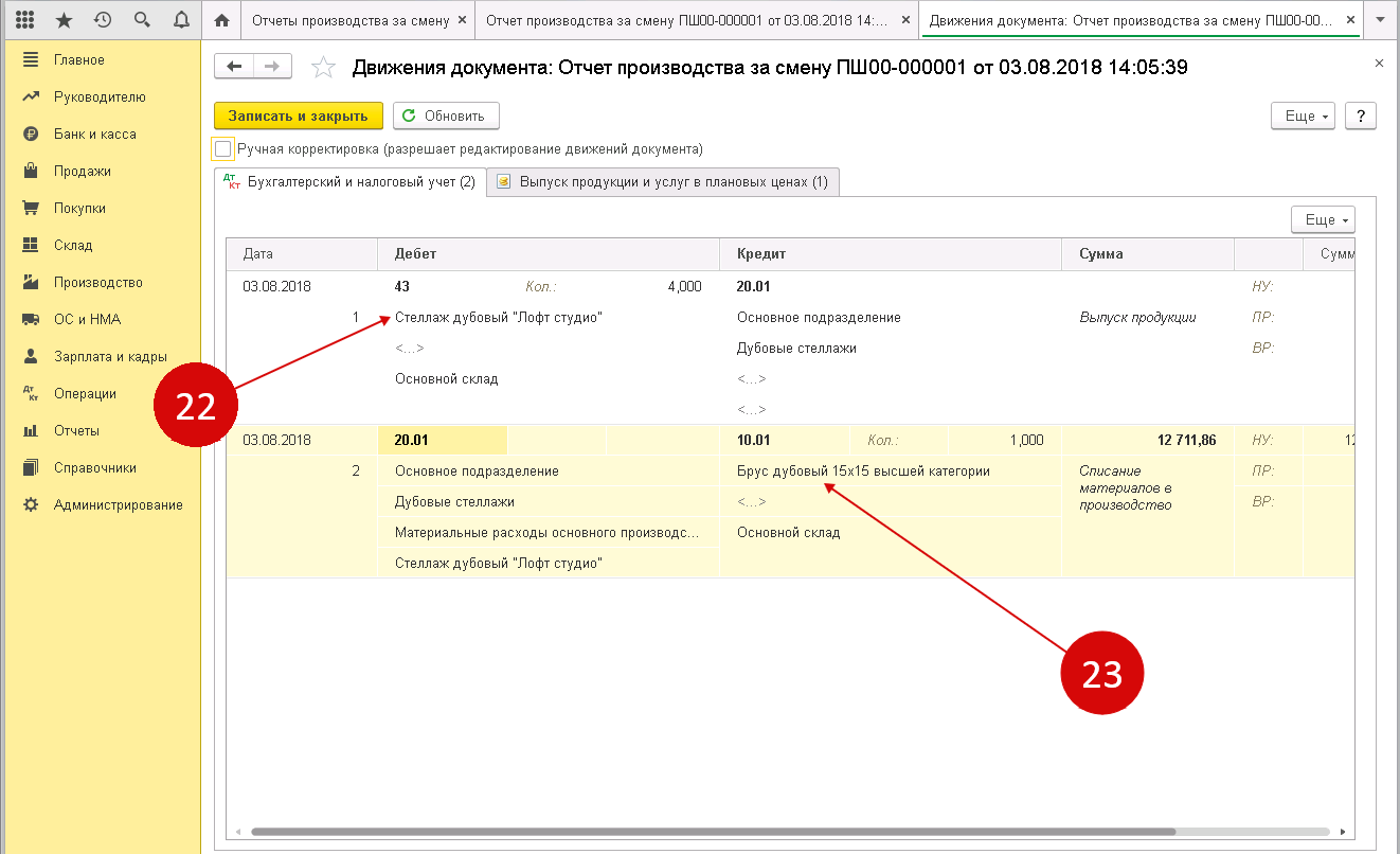 В проводках мы видим, что выпущенная продукция (22) отражена по дебету счета 43 «Готовая продукция». Материалы (23) списаны в производство в дебет счета 20.01 «Основное производство». Одним документом сформированы проводки и по выпуску продукции и по списанию материалов для производства этой продукции. В этом отличие отчета производства за смену от требования-накладной.