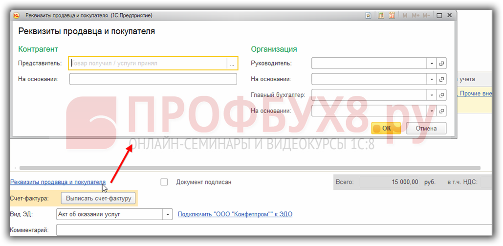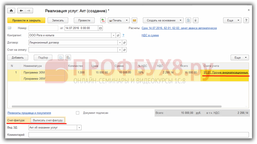 Если реализация производится с НДС, то необходимо выставить счёт-фактуру, воспользовавшись командой Выписать счёт-фактуру.