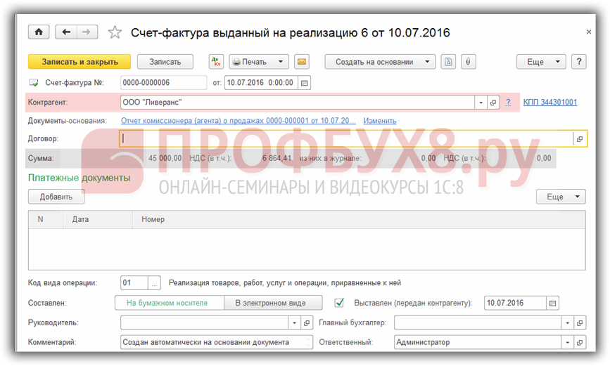 Реализация. В поле Покупатель указываем контрагента, которому реализовал товар комитента, если покупателю выставили счет –фактуру то поставим соответствующий флажок в документе. Счет-фактура выданный, автоматически создается, при проведении документа: