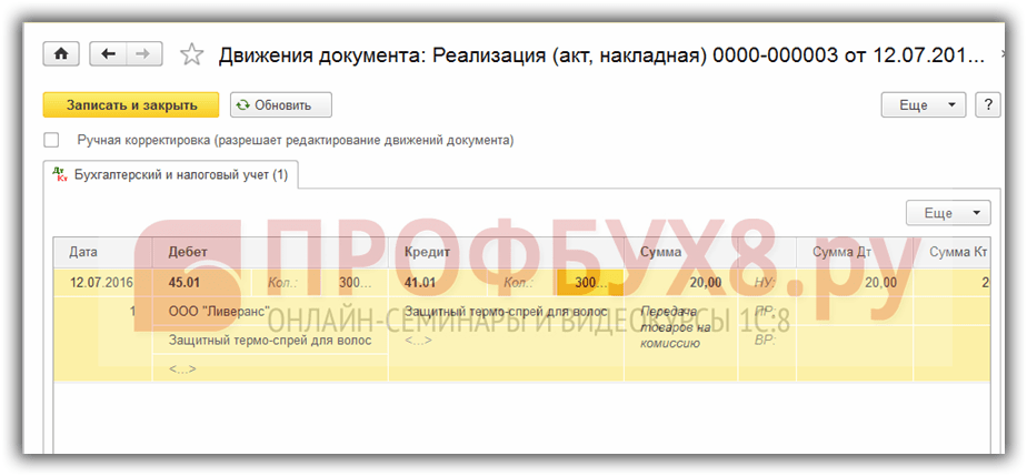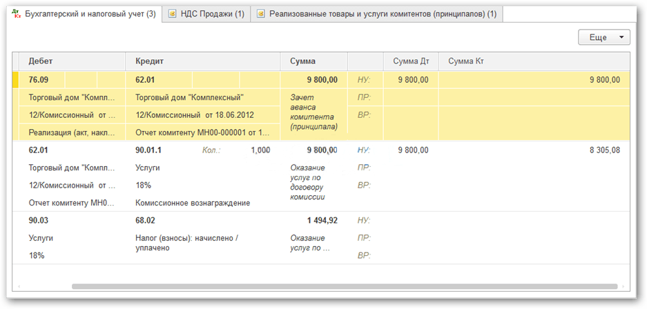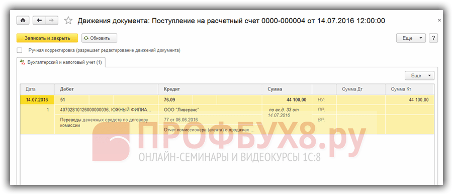 Проведем документ и посмотрим в 1С проводки по учету комиссионного вознаграждения: