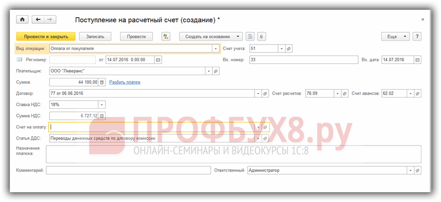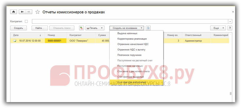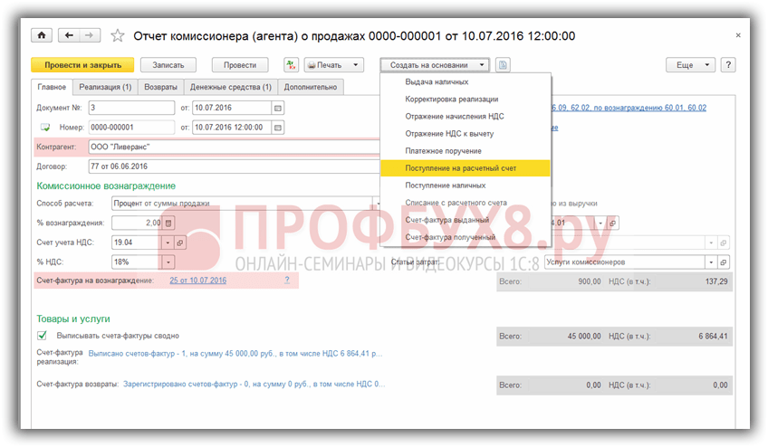 Создадим документ Поступление на расчетный счет на основании документа Отчет комиссионера (агента) о продажах: