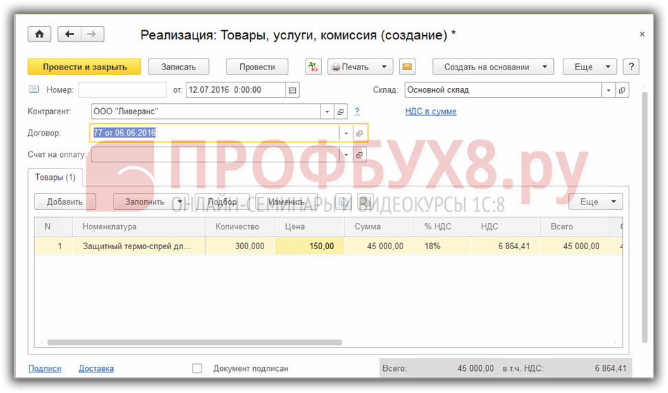 ); - договор с контрагентом — Договор комиссии № 24 (выбором из справочника Договоры контрагентов
