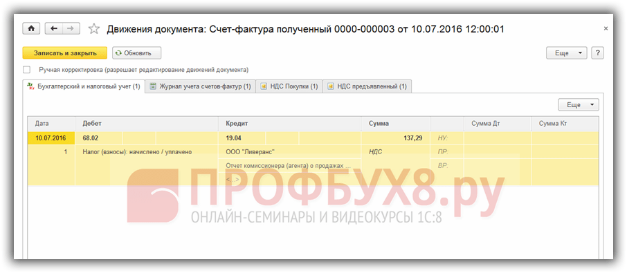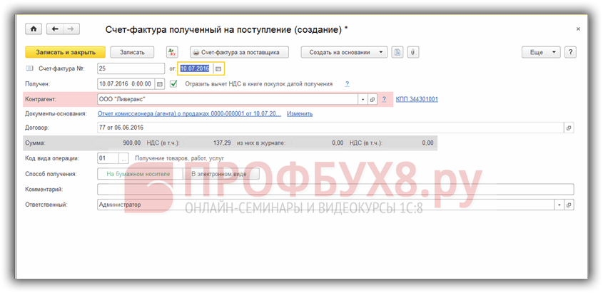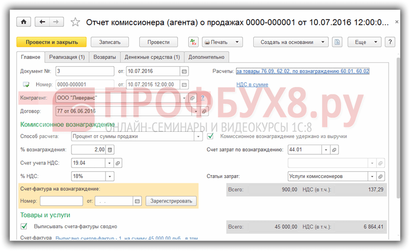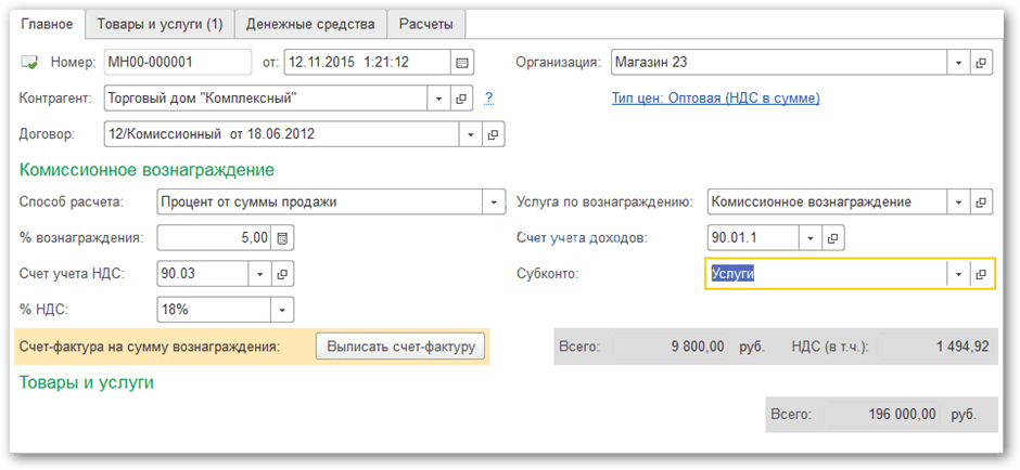 Регистрация счета-фактуры на сумму комиссионного вознаграждения
