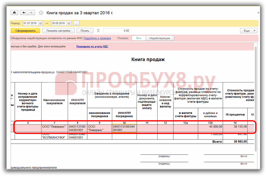 Счет-фактура перевыставляется комиссионером, поэтому в поле Организация указывается комитент, а в поле Контрагент – покупатель товара. Такие счета-фактуры отражаются в книге продаж: