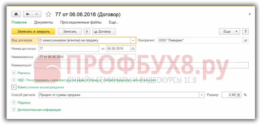 , в параметрах договора следует указать Вид договора — С комиссионером