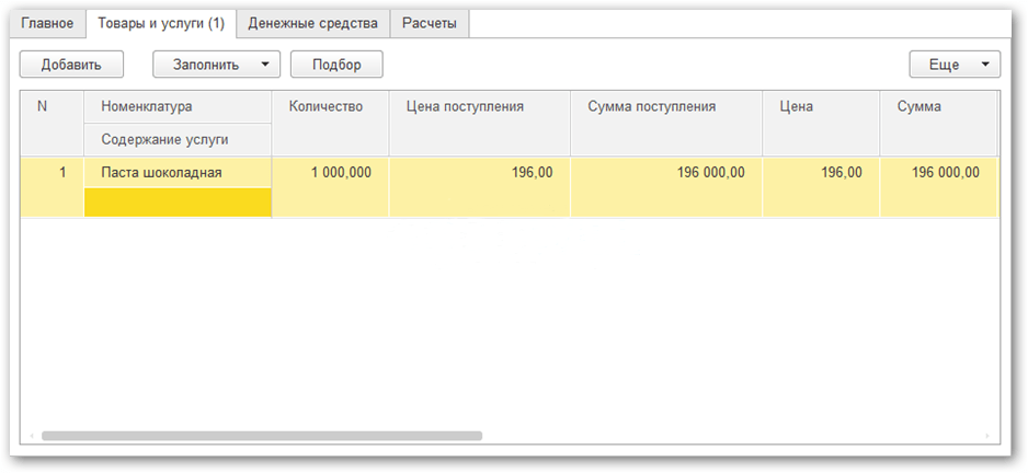 Табличную часть заполняем принимаемым товаром. Удобнее всего воспользоваться кнопкой «Подбор».