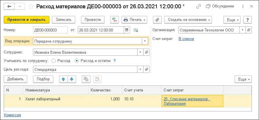 Для отражения операции по передаче работнику спецодежды и других ТМЦ с несущественной стоимостью используется документ «Расход материалов». При этом указывается тип операции — «Передача сотруднику».