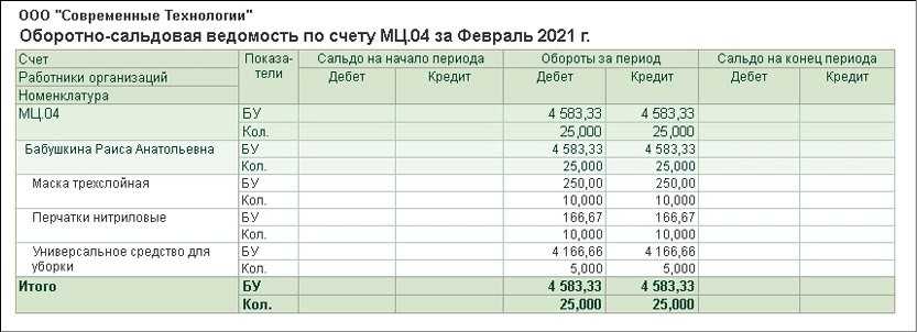 При установке переключателя «Учитывать по сотруднику» в положение «Расход» передаваемые работнику ТМЦ отразятся по Дт забалансового счета «Материальные ценности, переданные в эксплуатацию» и сразу спишутся с Кт счета. В таком случае компания может контролировать расход ТМЦ, переданных работникам, отдельно по каждому сотруднику. В этих целях можно сформировать стандартный отчет, к примеру, «Оборотно-сальдовую ведомость» по счету забалансового учета ТМЦ.
