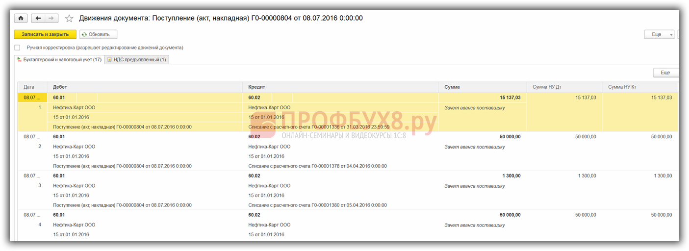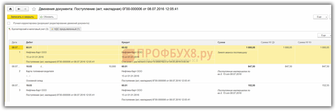 При окончательной обработке документа проводим документ кнопкой Провести и в итоге получаем проводки: