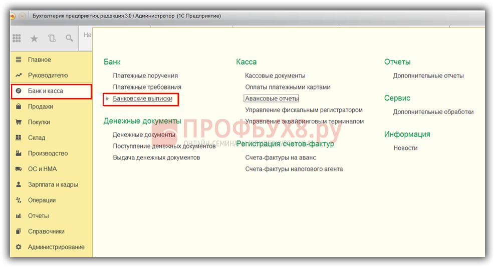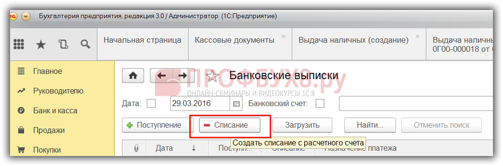 В случае покупки ГСМ (бензина) по топливным картам, в первую очередь необходимо сделать перечисление предоплаты поставщику через документ Списание с расчетного счета. Для этого нужно на вкладке Банк и касса использовать пункт Банковские выписки: