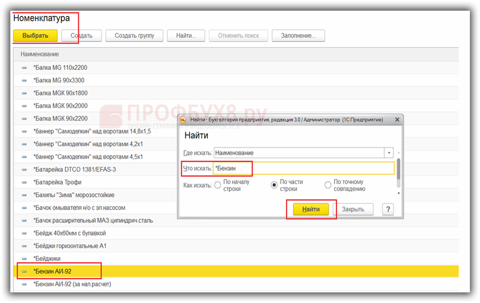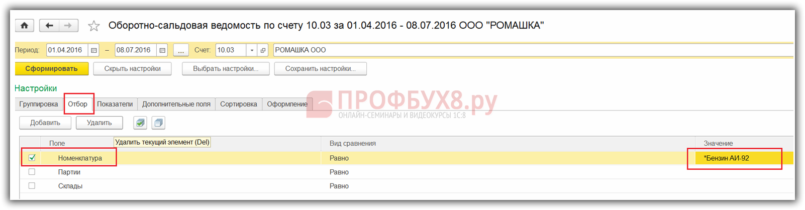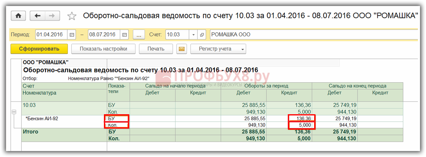 Открываем ОСВ по счету 10.3, задаем параметры отчета: период, отбор по номенклатуре, по количеству и формируем ОСВ. Отобрать по номенклатуре из справочника можно применив функцию Найти, задав в окно поиска ключевое слово Бензин:
