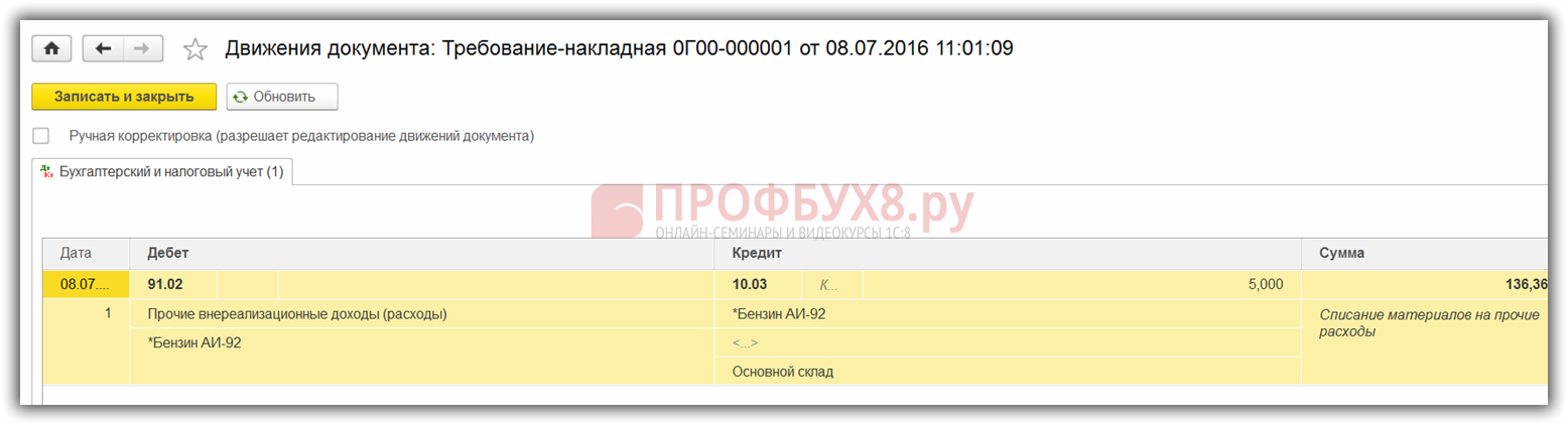 При списании ГСМ на непроизводственные нужды, списание топлива проводится тем же документом Требование-накладная, но на закладке счет затрат указываем счет 91.02 и статью затрат Не принимаемые к налогообложению:
