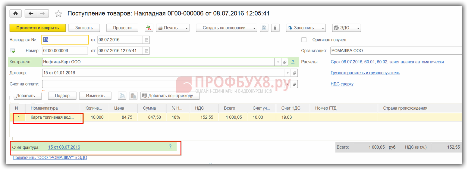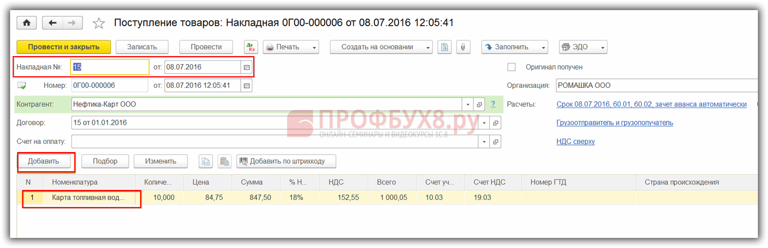 Создаем документ Поступление товаров. В поле Накладная ставим номер и дату документа поставщика. Кнопкой Добавить добавляем номенклатуру Карта топливная. Ставим количество, цену и поставщика: