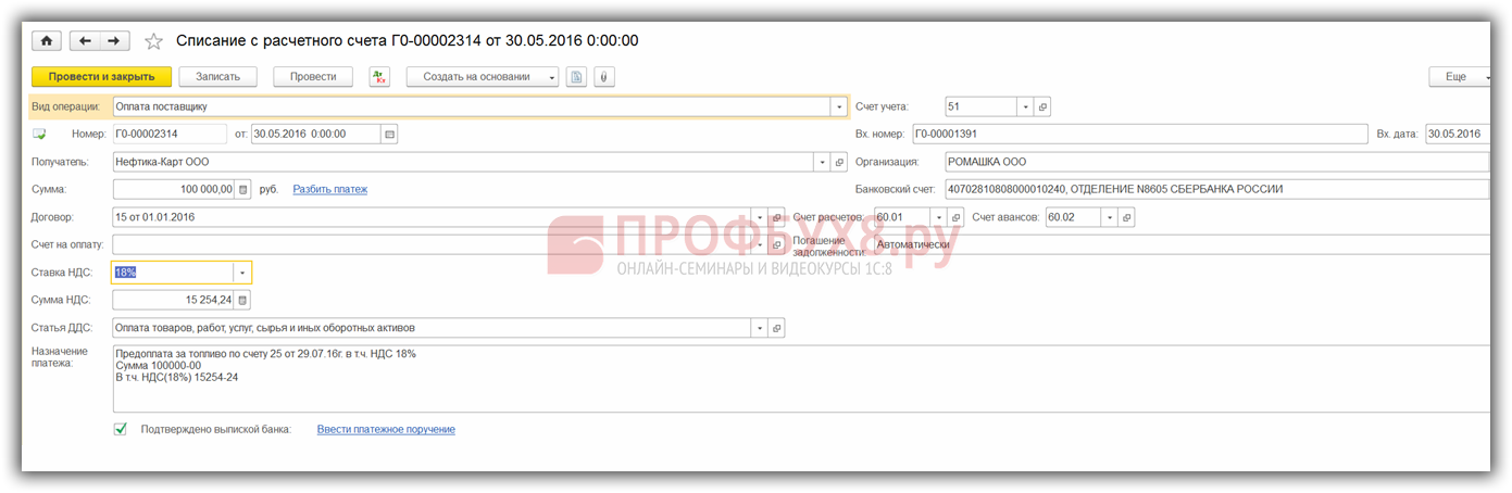 При проведении данного документа создается проводка Дт 60.02 Кт 51 на сумму 100 000 руб.: