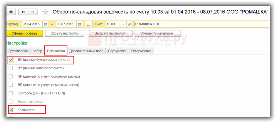 Можно задать параметры формирования ОСВ по показателям. В нашем примере по данным БУ и количеству: