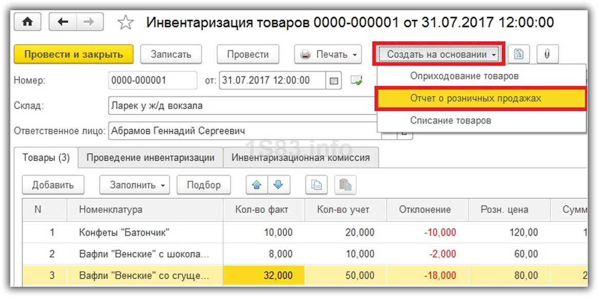 Обратите внимание, что в колонку «Количество» попали все данные из колонки «Кол-во факт» документа инвентаризации