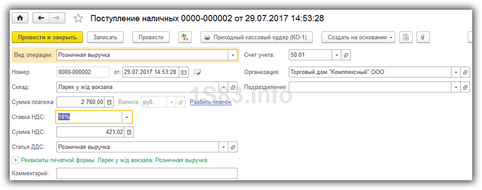 Первым делом нужно отразить поступление наличных с видом операции «Розничная выручка». Если в розничном магазине покупатель мог оплатить товар банковской картой, то здесь это маловероятно.