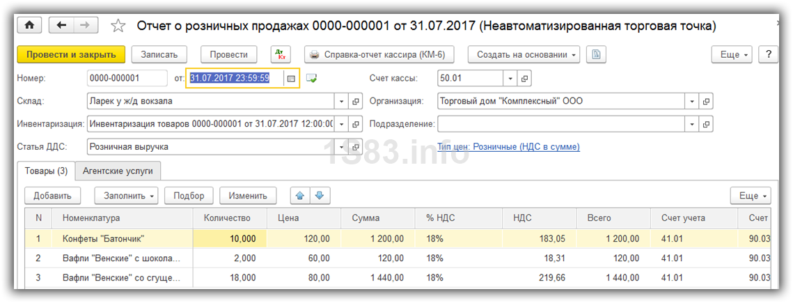 Пример заполненного документа приведен на рисунке ниже. При недостающей выручке отчет о розничных продажах у вас попросту не проведется.