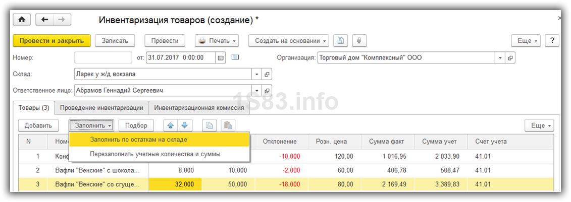 В документе инвентаризации укажем организацию, наш склад «Ларек у ж/ж вокзала» и при необходимости ответственное лицо. Для удобства заполним товары по остаткам на складе. После этого необходимо указать, сколько товаров фактически осталось в колонке «Кол-во факт».