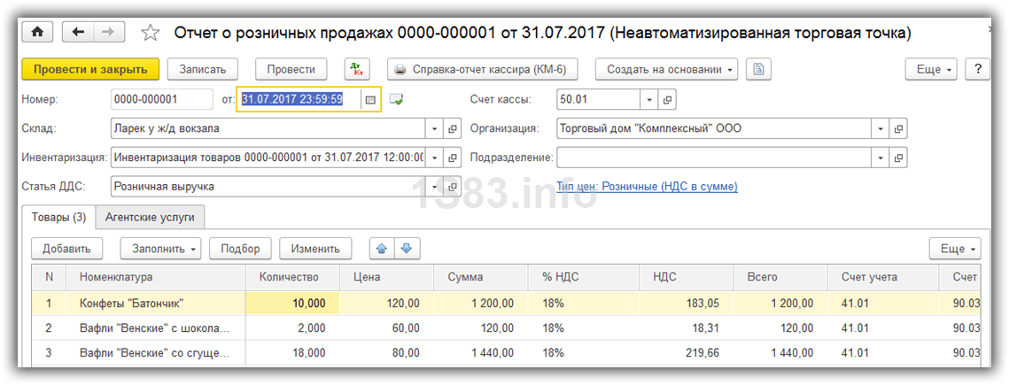 В документе указывается склад розничной точки, ставится флажок Неавтоматизированная торговая точка и сумма розничной выручки, которая формирует проводки по отражению выручки и списанию стоимости проданных товаров. З-6 заполняют на товары с истекшим сроком реализации или в упаковках, с не проставленным сроком. составить достоверную картину эффективности использования товарных запасов, величины прибыли, объема выручки от перечисленных показателей зависит сколько прибыли получит магазин, насколько его ассортимент востребован покупателями, как быстро пополняются запасы ;. В журнале поступлений на склад пишут 6 бубликов, фиксируется сумма 34,5 тенге;.
