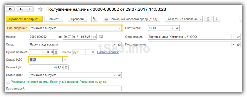 Первым делом нужно отразить поступление наличных с видом операции «Розничная выручка». Если в розничном магазине покупатель мог оплатить товар банковской картой, то здесь это маловероятно.