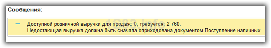Если вы не учли в программе полученную выручку, то программа не позволит провести документ и выдаст сообщение, подобное тому, что изображено на рисунке ниже.