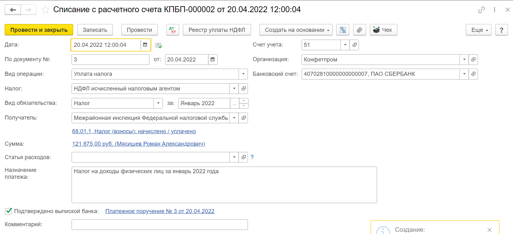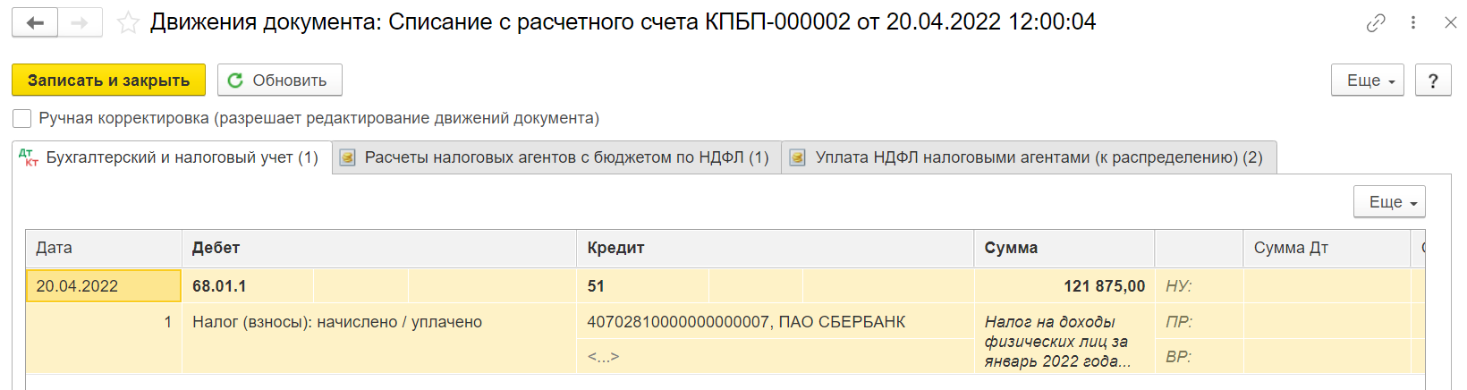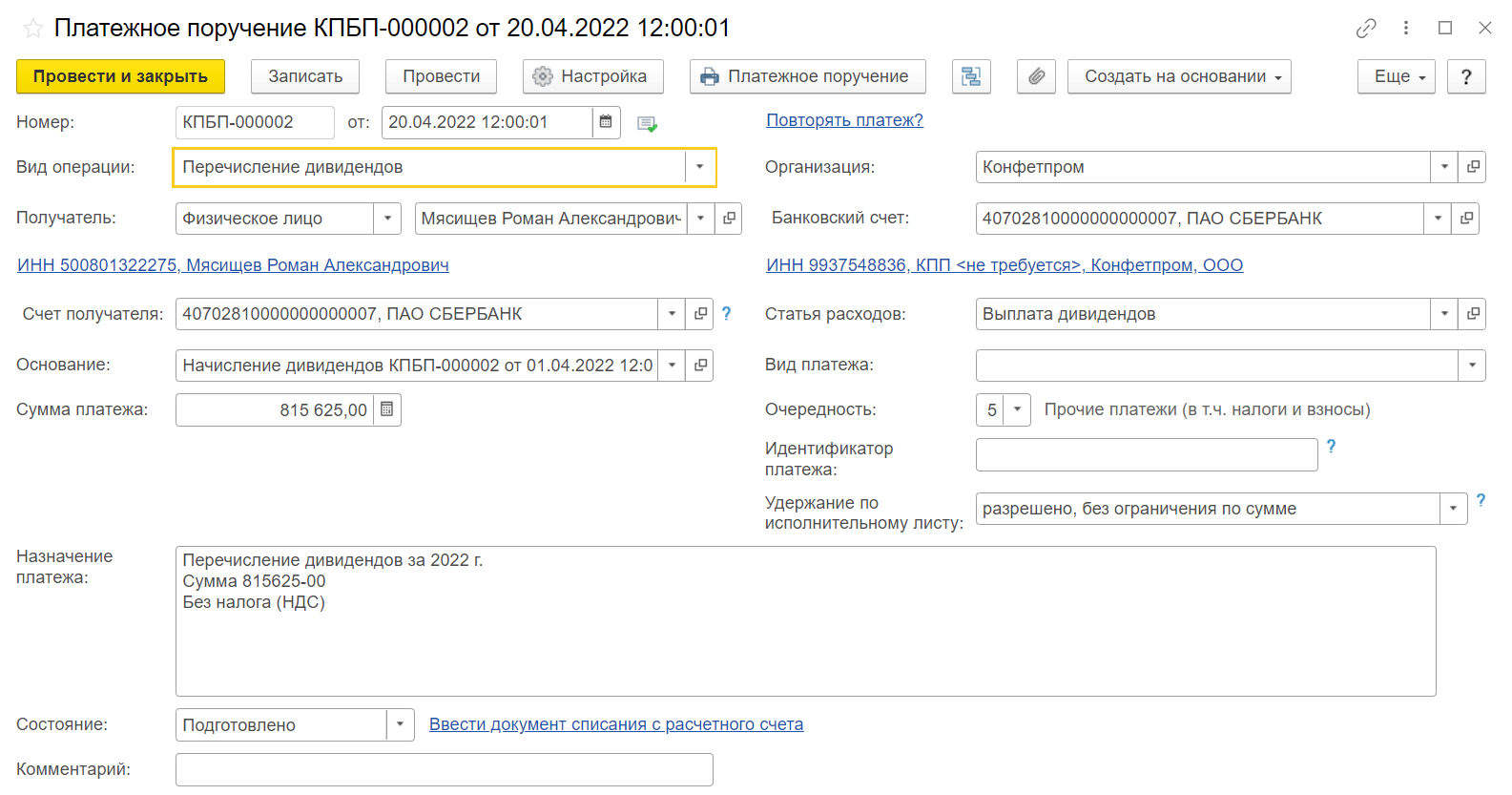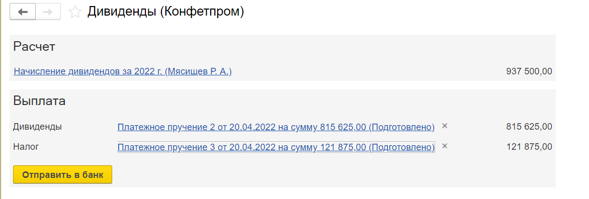 Автоматически будут сформированы 2 платежных поручения: одно на выплату дивидендов, второе – на уплату НДФЛ.