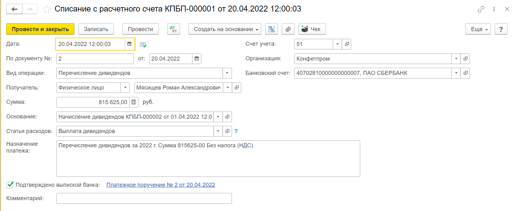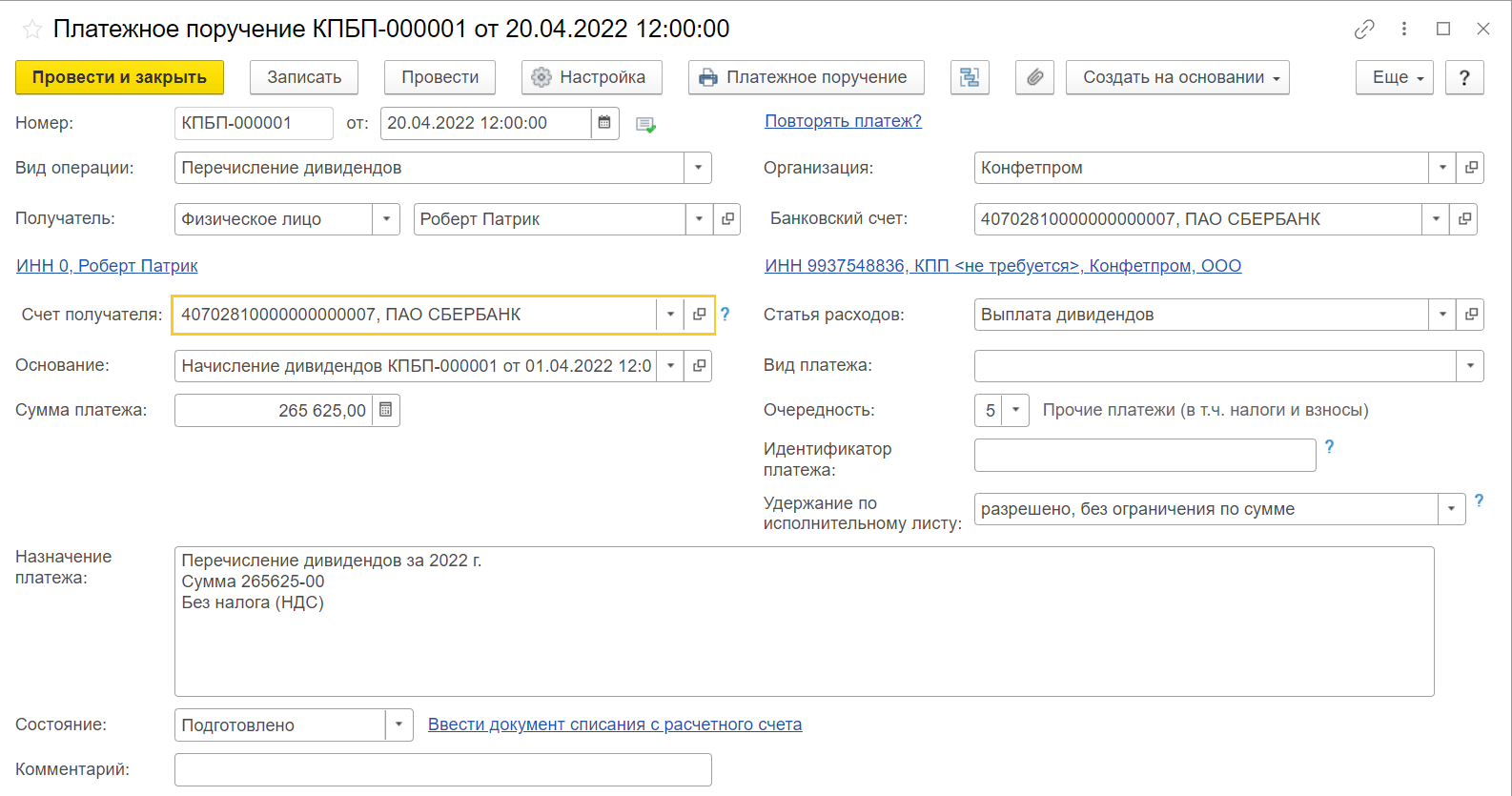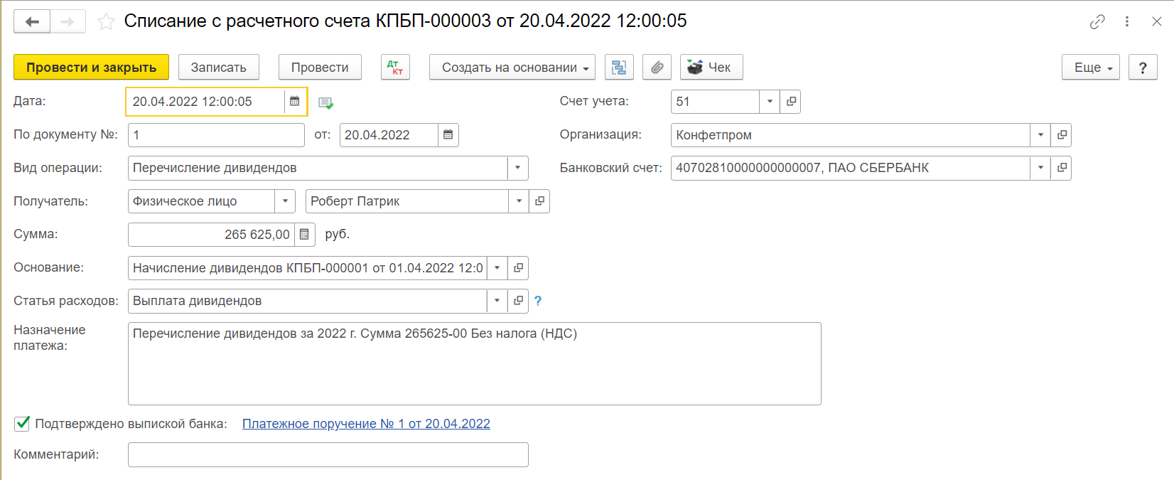 Документ Платежное поручение (создается из документа Начисление дивидендов):