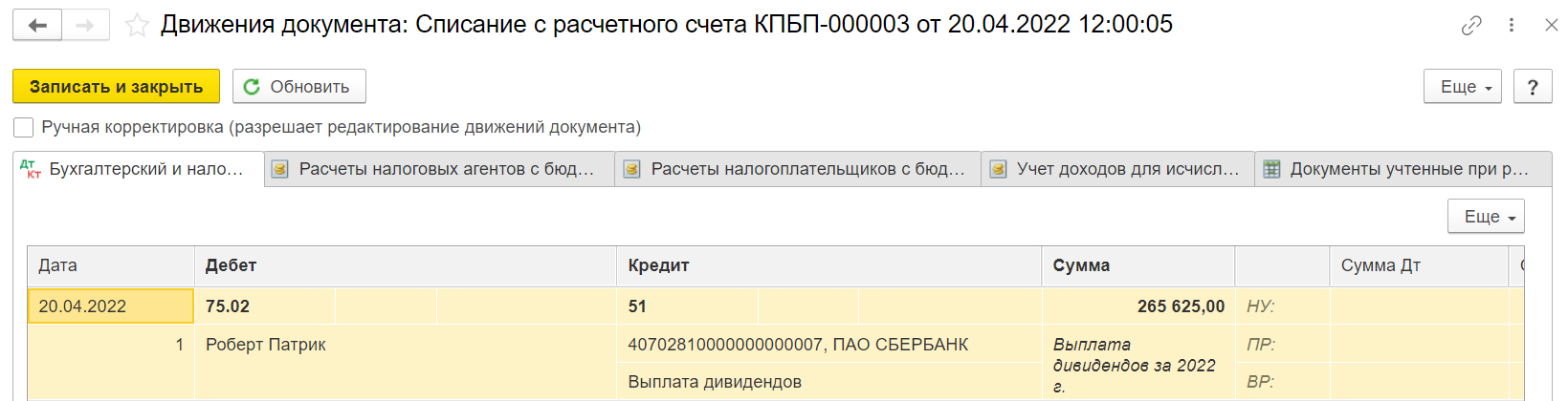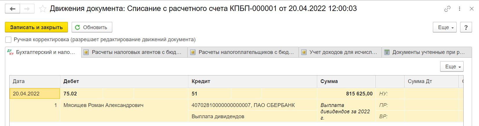 Выплата дивидендов по остальным участникам оформляется аналогично. Только по юр.лицу в поле Получатель будет установлено Юридическое лицо.