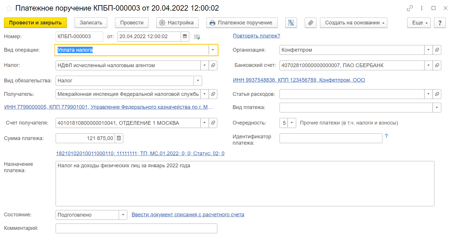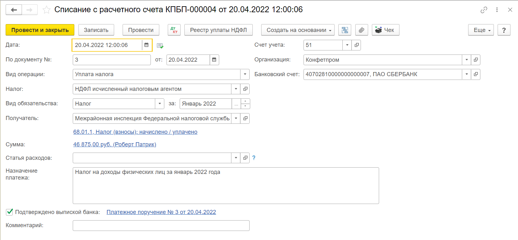 укажите получателя налогового платежа, перечисляемую сумму, счет 68.01.1 НДФЛ исчисленный налоговым агентом и субконто к нему