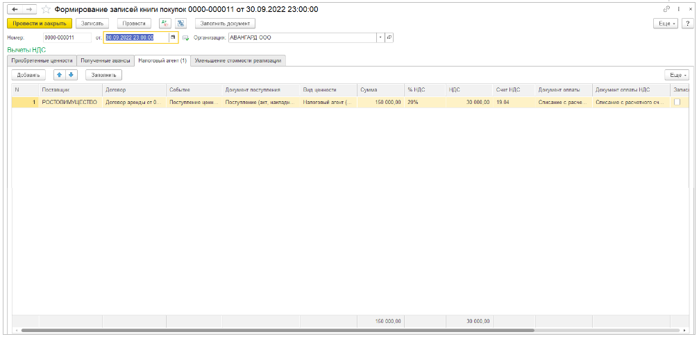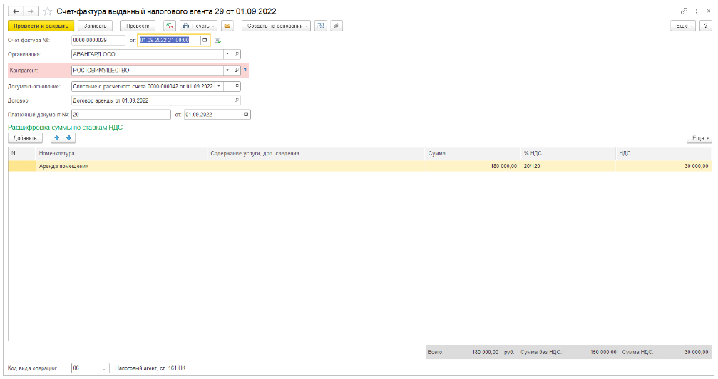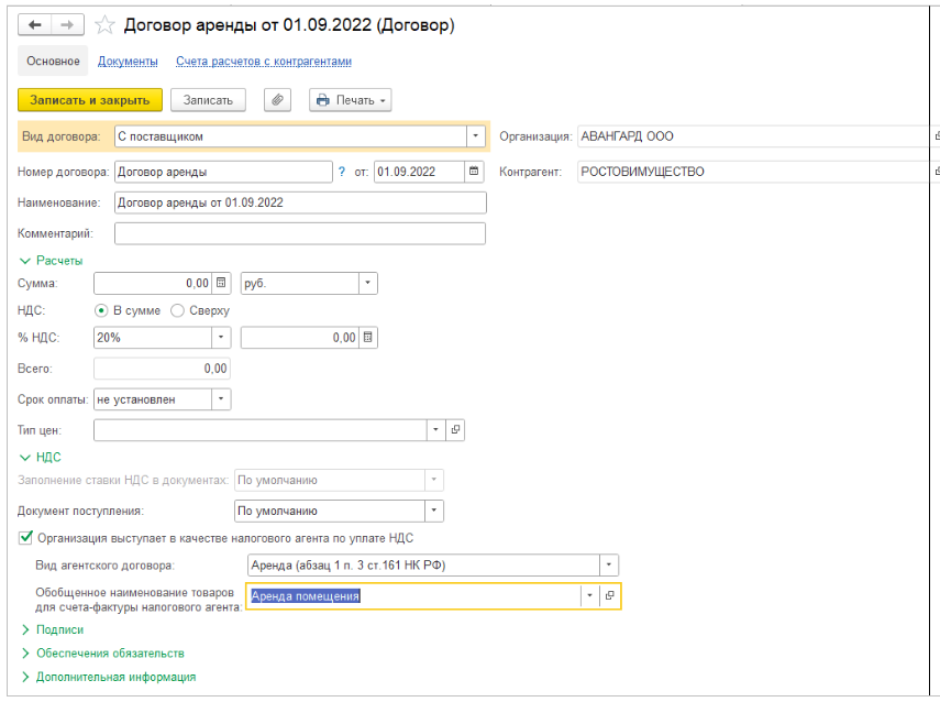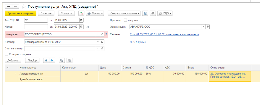1.09.2022 года поступил акт №12 от РОСТОВИМУЩЕСТВО с которым заключен договор аренды здания на сумму 180 000 рублей (НДС 20% в том числе). Нам необходимо в программе создать документ «Поступление (акты, накладные, УПД) («Покупки» — «Поступление (акт, накладные УПД»). При создании документа поступления необходимо создать договор арены с контрагентом, в котором указать, что организация выступает в качестве налогового агента.