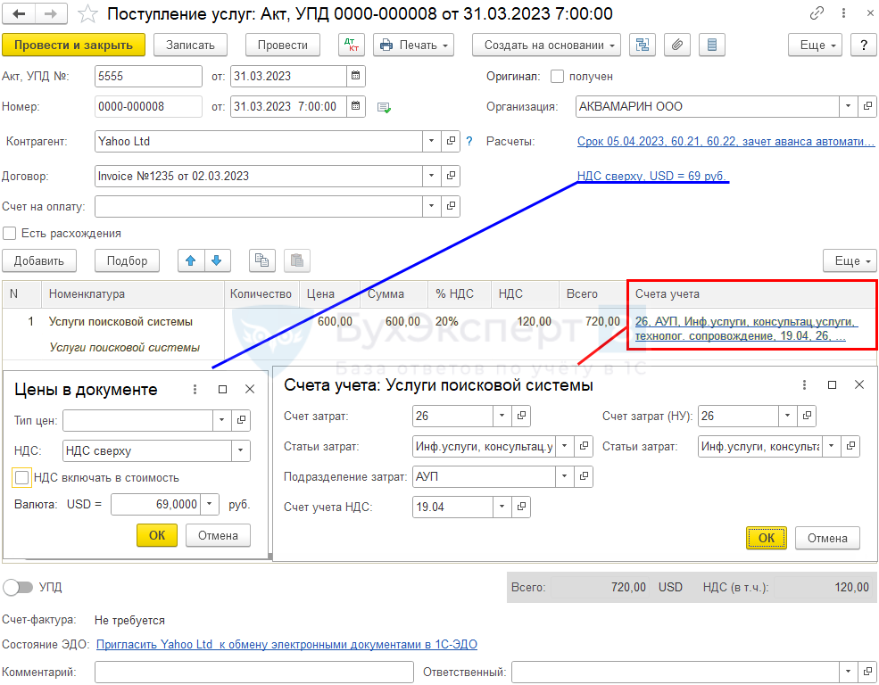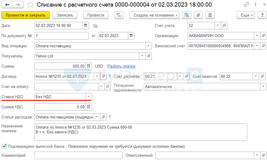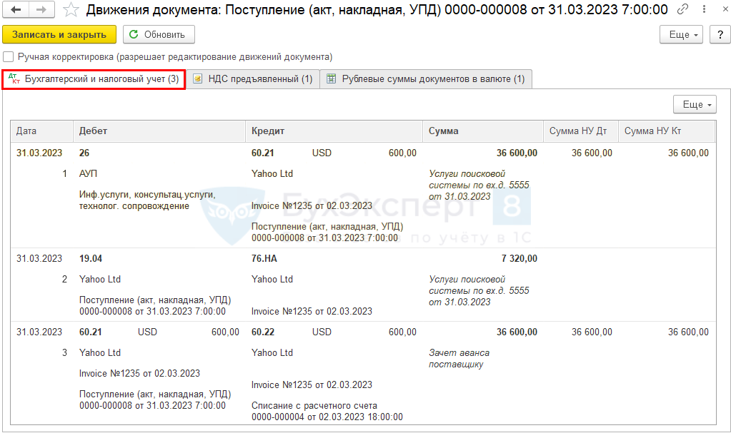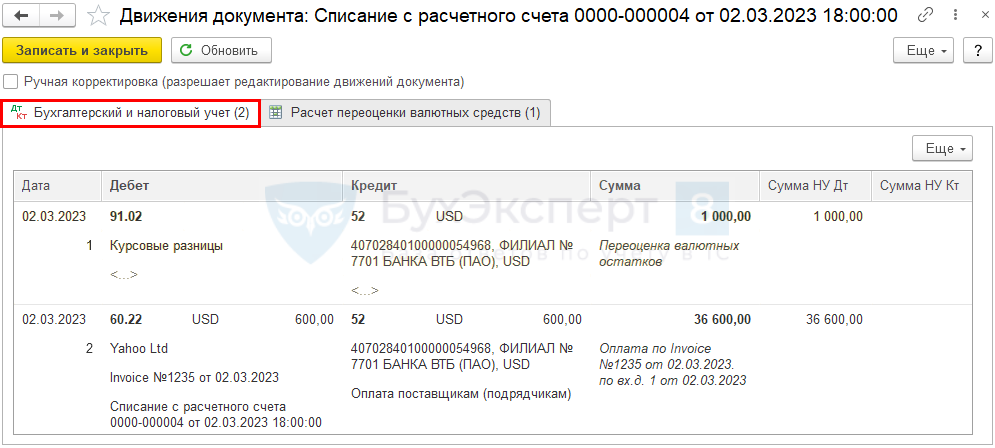 - Сумма — рассчитанная в валюте аванса (в нашем примере — 600 USD);