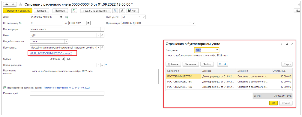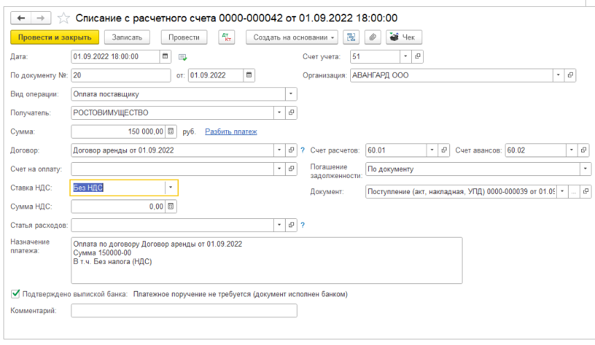 Следующее действие – оплата аренды контрагенту «РОСТОВИМУЩЕСТВО».