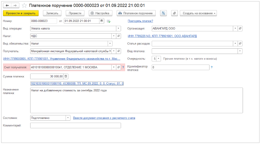 01.09.2022 года подготовлено платежное поручение, которое сразу отразилось в выписке.