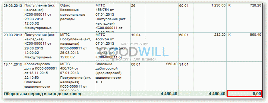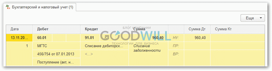 Рис. 4 Отражение проводок в документе «Списание задолженности» в 1С:ERP