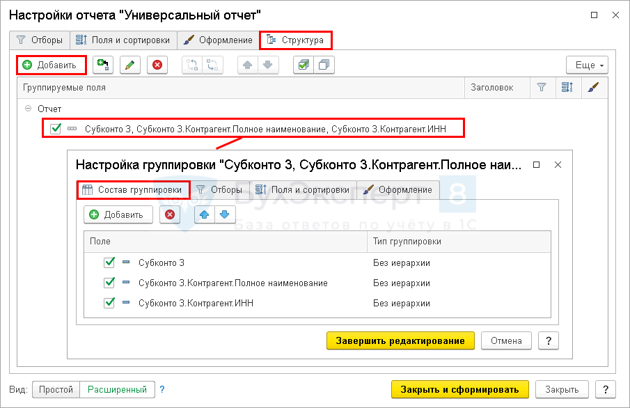 На вкладке Структура по кнопке Добавить укажите группировку отчета: