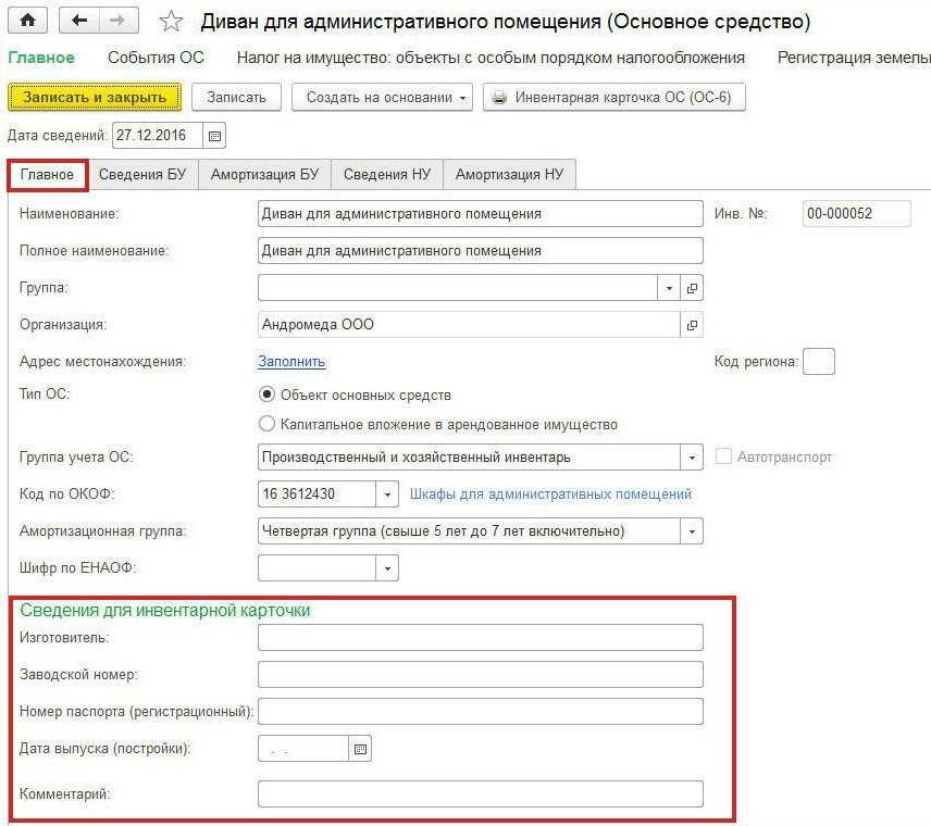 (сюда вынесена и группа реквизитов Сведения для инвентарной карточки