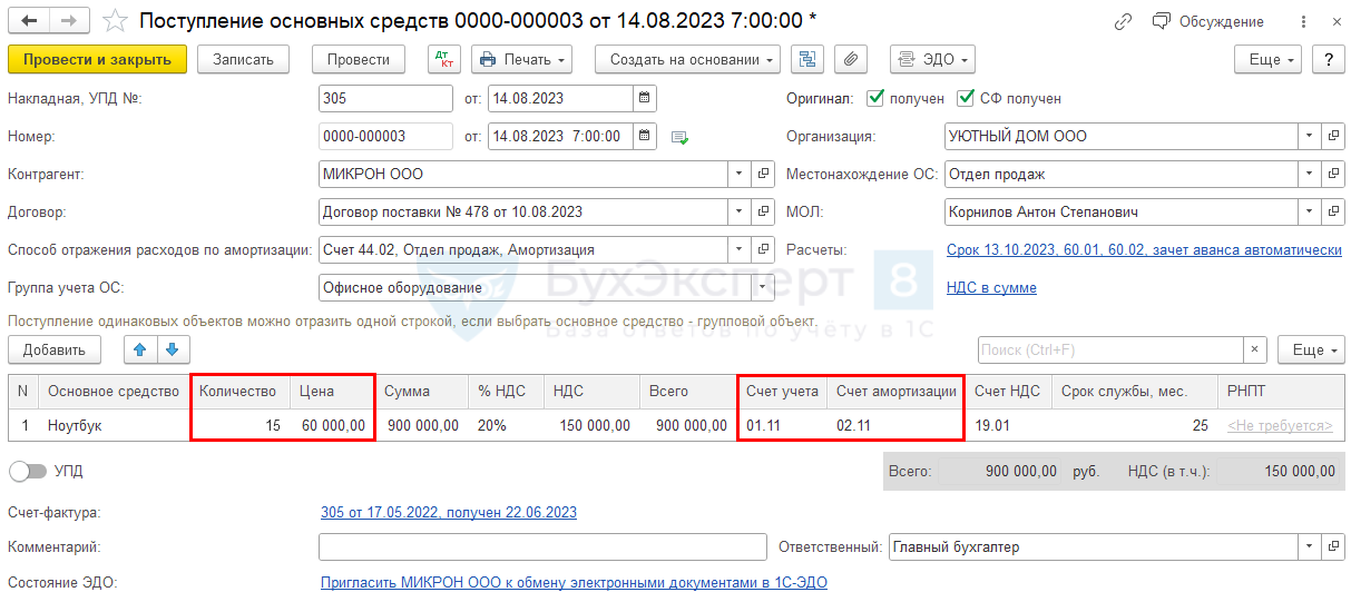Принятие к учету основных средств в 1С 8.3