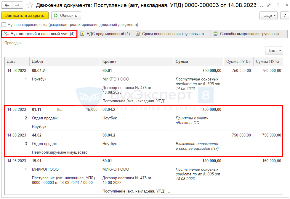 - Дт 44.02 Кт 08.04.2 — стоимость неамортизируемого имущества учтена в расходах по НУ единовременно при вводе в эксплуатацию;