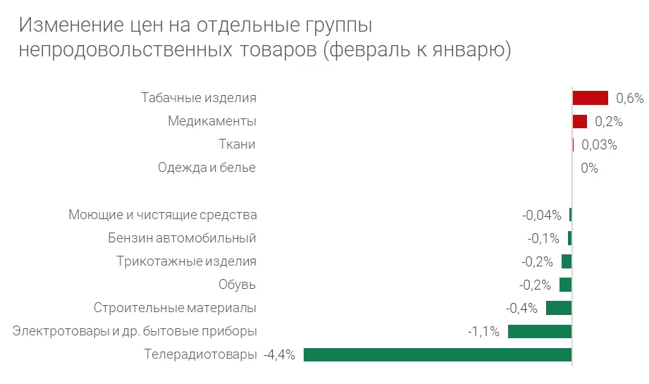 В феврале услуги подорожали сильнее товаров (0,72% против 0,37% в январе), в то время как цены на продовольственные товары выросли на 0,79%, а на непродовольственные, наоборот, снизились на 0,08%.