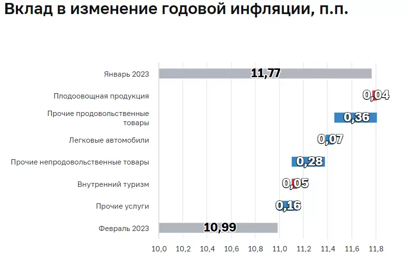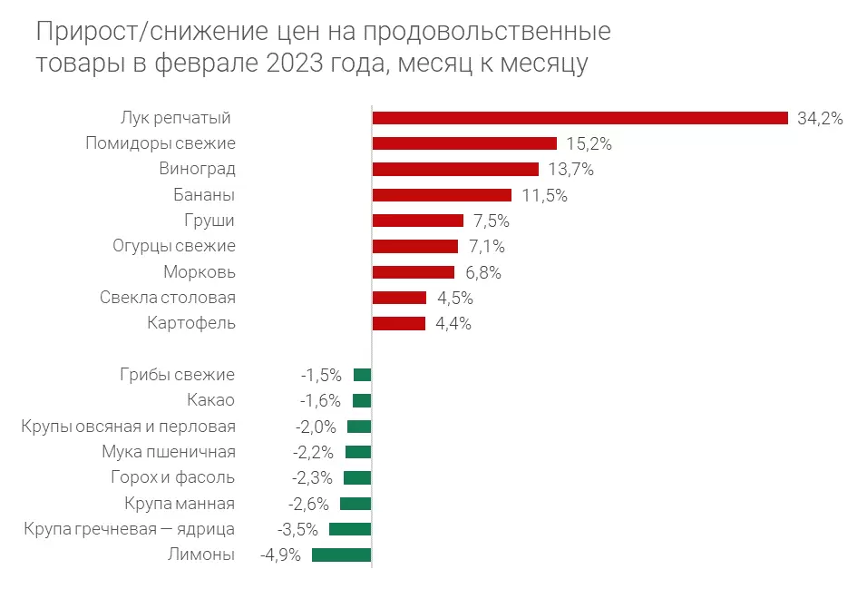 В разрезе продовольственных товаров цены на плодоовощную продукцию выросли на 6,69% по отношению к январю, а на неплодовоовощную сократились на 0,03%. Несмотря на существенное увеличение цен на плодоовощную продукцию в феврале, темпы роста в этой категории упали относительно января — декабря (11,38%). Причиной замедления роста цен Центральный банк называет нормализацию предложения тепличных овощей.