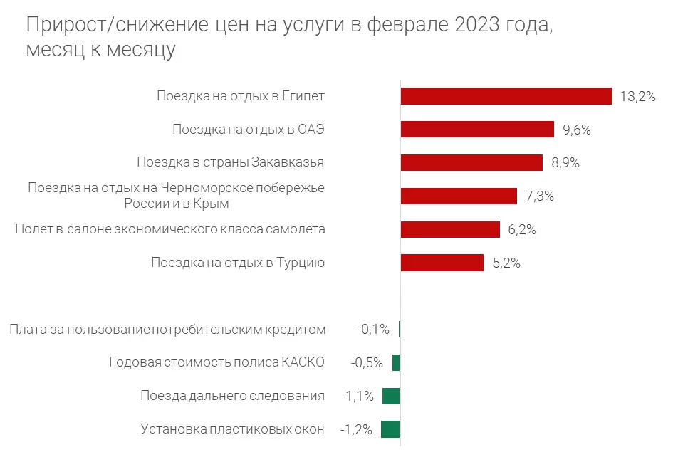 Среди зарубежного туризма наибольший прирост цен показали поездки на отдых в Египет, ОАЭ и страны Закавказья. Отдых на Черноморском побережье России и в Крыму также увеличился в цене по сравнению с предыдущим месяцем.