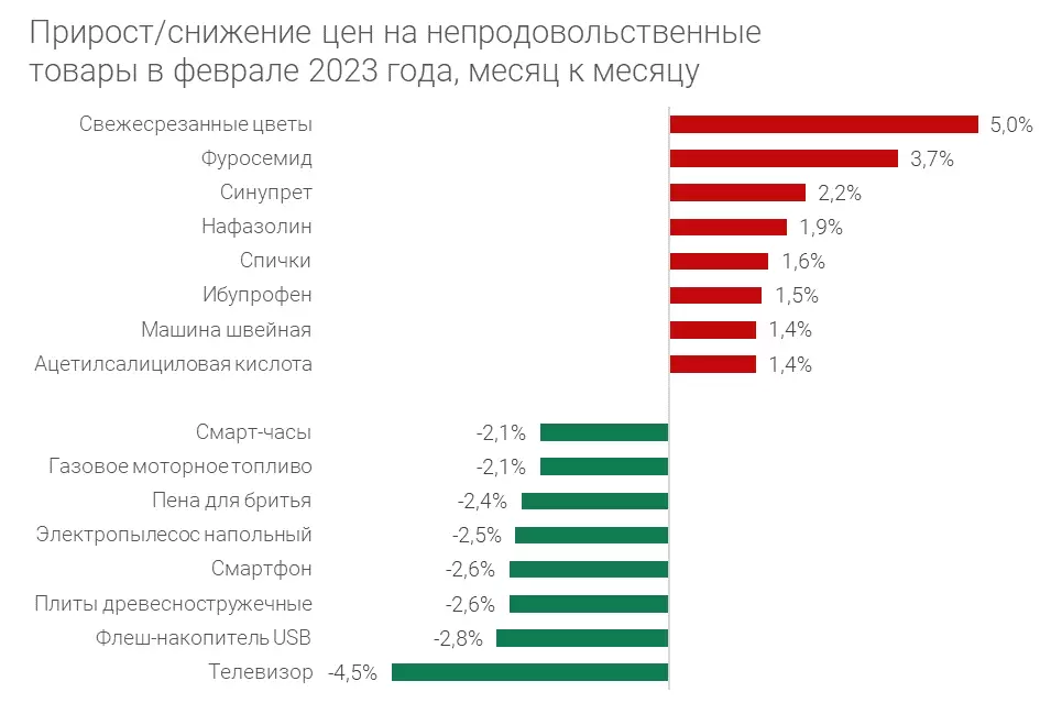 Сильнее всего среди непродовольственных товаров подешевели телевизоры, а самый масштабный рост продемонстрировали цены на свежесрезанные цветы и отдельные виды медикаментов (например, Фуросемид и Синупрет).